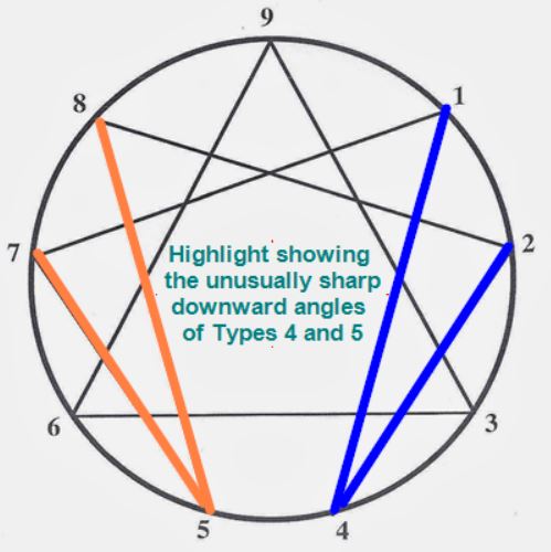 The angles coming in at Points 4 and 5 are the least open, the least reflexively embracing. In contrast to the hashtag #allthefeels, this is the exact opposite – a narrow set of feels (and thinks). No other connecting lines on the ennea-symbol are so (symbolically) self-condensing as these two.